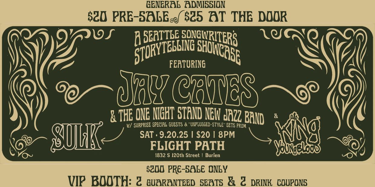 Jay Cates is proud to co-headline The Seattle Songwriters' showcase with our extraordinarily talented friends in SULK and King Youngblood, on Saturday, September 20th, 8:00PM at Flight Path, in Burien.